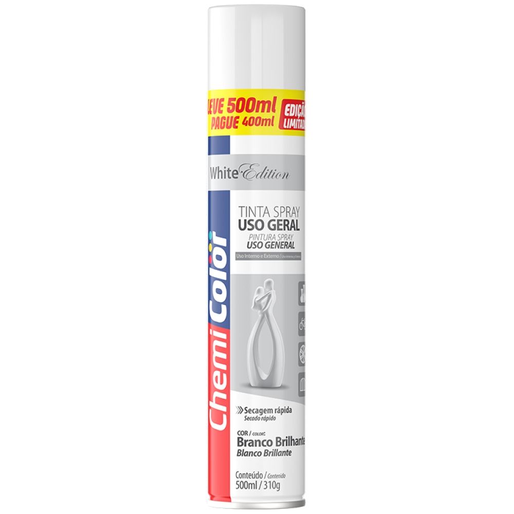 Tinta, Spray, Uso Geral, 500ml, Branco, Brilhante, Chemicolor